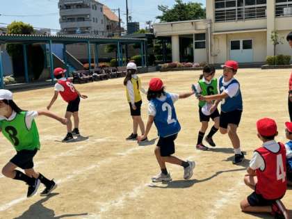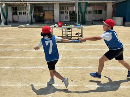 4年生は運動会で行うリレーの練習です。チームに別れてバトンを渡す練習をしました。走ってくる友だちとタイミングを合わすのは難しいようで、はじめは上手く行かないようでしたが、声をかけ合って頑張っています。本番を楽しみにしてください。