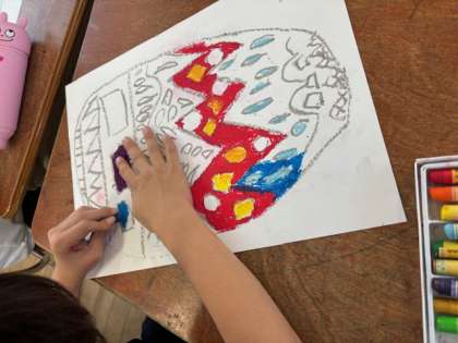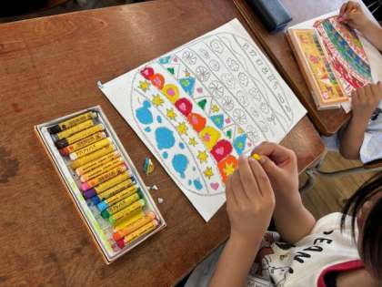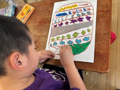 2年生は図画工作科で不思議なたまごを作っています。たまごの中に様々な模様を書き込み、クレヨンで塗り込んでいきます。オリジナルでカラフルなたまごができあがりそうです。たまごを割ると中から何が飛び出してくるのでしょうか。お楽しみに〜。