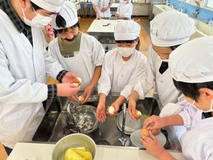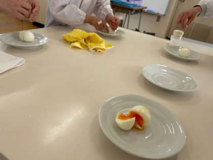今回の調理実習では、ゆでたまごを作ります。ゆで時間によって卵の固さが変わってきます。今日は好みの固さを決めて沸騰してから4分、5分とお鍋から取り出す時間を計ります。みんな、綺麗に固まる黄身を見て感動していました。
