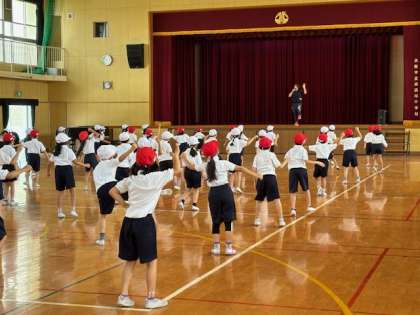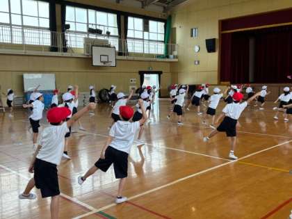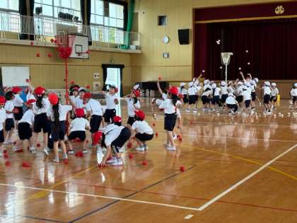 1年生は玉入れの練習しています。音楽に合わせて、カゴに向かって投げたり、ダンスを踊ったり大忙しです。1年生は可愛いので、もっと踊ってほしいと思ってしまいます。さぁ本番はたくさん入るでしょうか?可愛いダンスもお楽しみに〜
