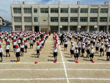 今日は運動会に向けて、始業式や開会式の練習をしました。児童会のメンバーが司会をして、全校で行いました。暑い中でしたがとてもよく頑張りました。