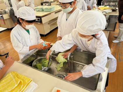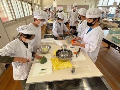 5年生は家庭科の授業でサラダを作りました。材料を洗ってから、食べやすいサイズにカットしていきます。茹でた野菜を冷ましてからドレッシングをかけていただきました。お味はどうだったでしょうか??野菜が苦手な子が多いようです。少しずつ食べれるようになってほしいです。