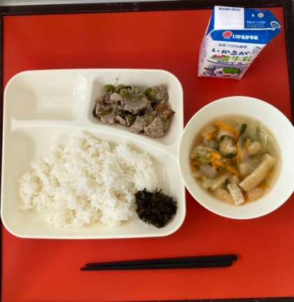 つくだ煮は、小魚やこんぶ、貝などいろいろな材料を塩やしょうゆ、砂糖などで煮つめたものです。今日の給食には椎茸を煮て、かつおぶしときざみのりを加えて煮つめた佃煮が登場します。