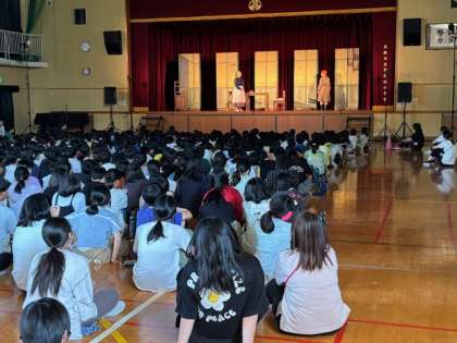 今日はViproという劇団の方にお越しいただき「赤毛のアン」の劇を見せていただきました。舞台の背景や照明が何度も入れ替わり、子どもたちも惹きつけられるように見ていました。主人公が間違いそうな舞台に向かって「ダメダメ〜」と大きな声で呼びかけていました。最後のシーンには感動した子が多かったようです。