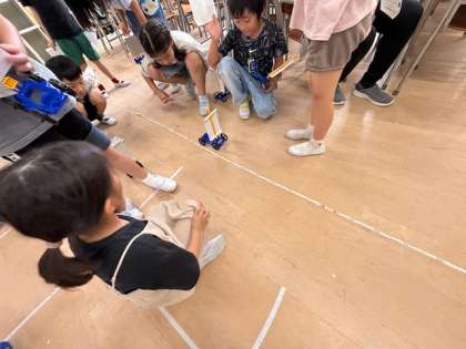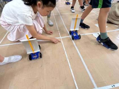 3年生は理科で風のはたらきを学習しています。模型に後ろから風を当てて走らせます。風を強くすると、模型が動く距離はどうなるでしょうか?同じ位置から同じように風を当てるのが難しいそうです。しっかり予想しながら実験しています。