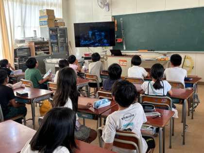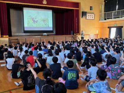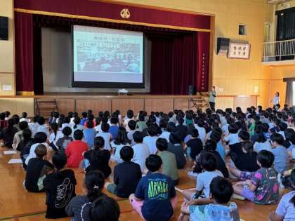 今日の集会は「平和について考える」集会でした。スクリーンを見ながら、絵本を紹介したり、戦時中の東淀川区の様子を話したりしました。戦争がないことだけが平和ではなく、自分たちの生活や家族、友だちのことなどを振り返るきっかけになればと思います。校長先生からも、平和は与えられるものではなく、みんなで意識して作っていくものだよ。というお話がありました。教室でも平和や命について考える学習をしています。