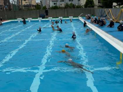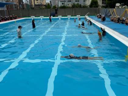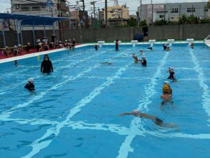 一年生もプールでの学習に慣れてきました。初めは顔に水がかかることを怖がる子も多かったですが、今では多くの子が顔をつけることができるようになっています。あと1週間となりましたが、夏休み中も事故のないように水に慣れ親しむ機会を作っていただければと思います。