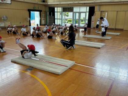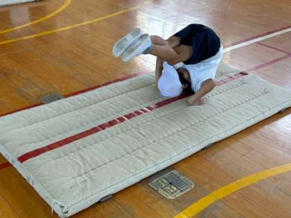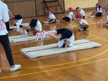 今日の体育はマット運動です。2年生は後転にチャレンジしています。両手をマットにつけて支えながら回ります。上手く回れず、元の位置に戻ってくる子もいますが、何度も練習しています。少しずつ勢いよく回ることができるようになってきました。