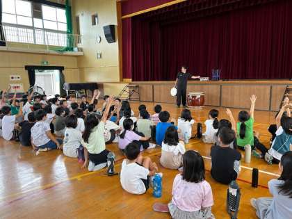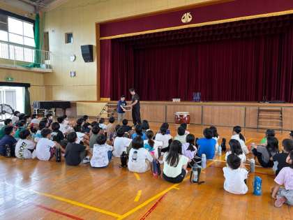 4年生は和太鼓の学習を始めています。本日は、和太鼓奏者「輝」さんに来て頂き、和太鼓についての歴史や太鼓の種類についてお話頂きました。あさっても和太鼓の演奏法に教えに来て頂く予定で、子どもたちはワクワクしているようです。10月の学習発表会に向けて頑張ってほしいです。
