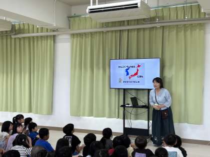 1年生はソンセンニムに韓国・朝鮮のあいさつや、じゃんけん、歌などを教えていただきました。「カウィ、バウィ、ボ」とみんなで元気にじゃんけんしました。世界には様々な文化があります。親しみを持って楽しく学んでいってほしいです。