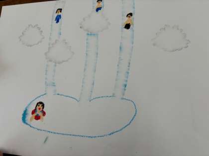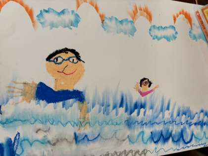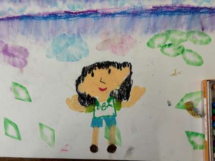 2年生は夏休みの思い出を描いています。クレパスで描いてから、指でぼかしながら表現していきます。海やプールに行った楽しい思い出がたくさん描かれています。「先生見て〜」と嬉しそうに紹介してくれます。