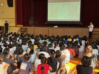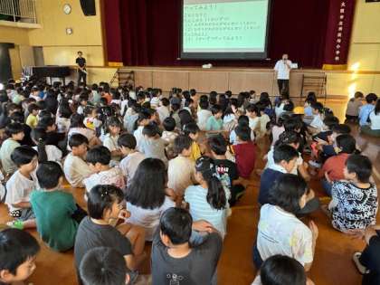 今日は体育館で学習朝会を行いました。1学期から継続して月に1回は学習朝会を行い、楽しく1週間がスタートできるようにしています。今日はみんなで、お団子じゃんけんをしました。数の学習として楽しくじゃんけんしています。今週も元気に学習を頑張ってほしいです。