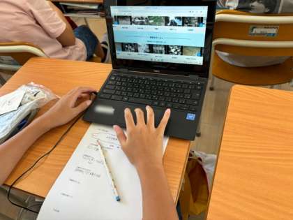 6年生は修学旅行に向けて平和学習を進めています。今日は戦争へと向かってしまう経過や戦時中のくらしについて調べました。タブレットを使って資料を見たり、動画で説明を聞いたりして、ワークシートにまとめています。修学旅行までにしっかり学び、色々な事を感じてほしいです。