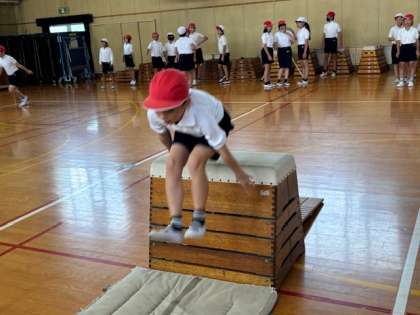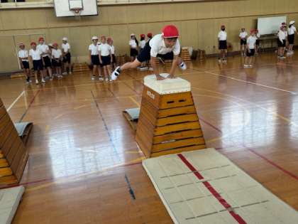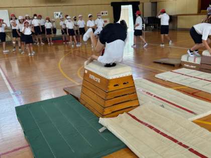 5年生は跳び箱の学習をしています。開脚跳びや閉脚跳び、台上前転などの技にチャレンジしています。5年生になると跳躍力もつき、開脚とびでは多くの子どもたちが8段を軽々と跳び越えていきます。