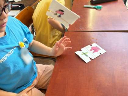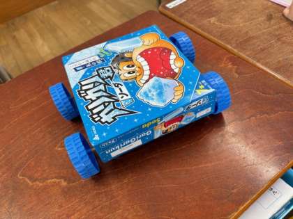 2年生は動くおもちゃづくりをしています。お菓子の箱にタイヤをつけて車にしたり、輪ゴムを使ってピョンピョンはねるおもちゃを作ったりしています。風の力やゴムの力で動くように工夫していきます。