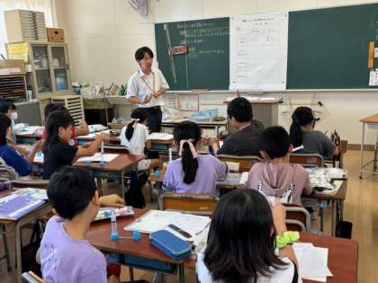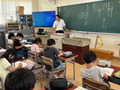 1組は国語科でした。主語や述語を確認して、詳しくする言葉を学びました。「先生が・・・」当てはまる言葉を言いましょう。子どもたちから出た言葉は・・楽しいですね。