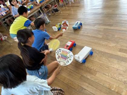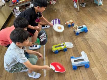 2年生は自分たちで作った風で動く車を走らせています。今日はうちわで風を送って車を走らせています。上手に作らているので、よく走ります。
