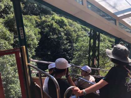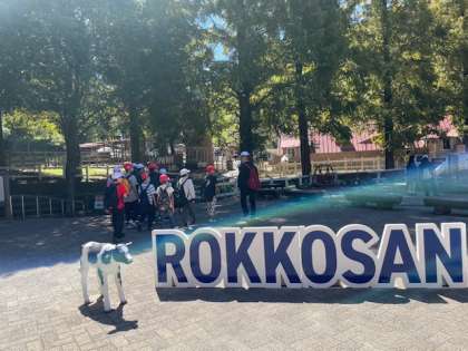 5年生は六甲山牧場に着きました。ここで動物と触れ合ったり、お弁当を食べたりします。どんな動物がいるでしょうか。とてもいい天気です。