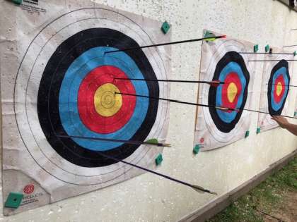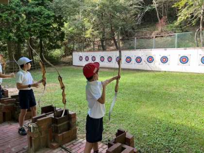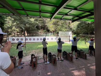 午後からは体験コーナーです。グループごとに別れて活動します。こちらはアーチェリーです。弓の持ち方を教えていただき、勢いよく矢を放ちます。上手く的に命中しています。なかなかのセンスです。