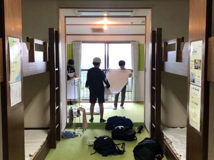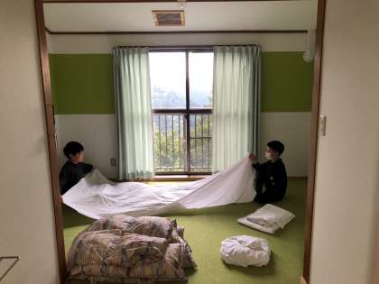 お世話になった宿舎での清掃活動です。次に利用される方のためにも、部屋をきれいに片付けます。使った寝具もみんなで折りたたみます。自分たちの荷物も整理しました。忘れ物はないかなぁ??