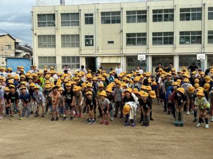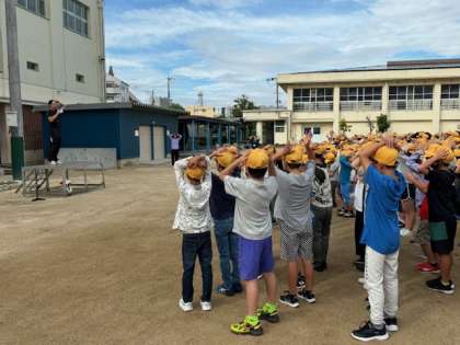 今日は運動場で運動朝会を行いました。担当の先生の掛け声に合わせて体を動かしています。指示を聞いて素早くポーズをとる運動です。今週も元気に頑張りましょう。