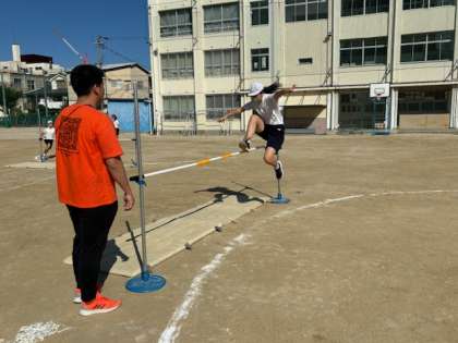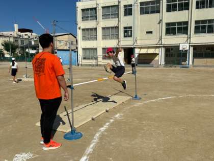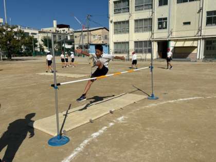 6年生は走り高跳びの学習です。助走から歩幅を合わせて踏み切ります。足を振り上げてバーを越えていきます。自分の目標の高さで、何度も練習を繰り返しています。