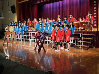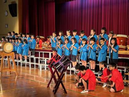 4年生は総合的な学習で練習した和太鼓を演奏しました。お祭りのお囃子をリコーダーや鐘と合わせて演奏しました。和太鼓の鼓動と子どもたちの真剣な表情が心に響く発表となりました。