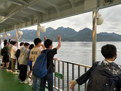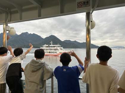 広島市内での平和学習を終え、子どもたちはフェリーに乗り宮島へ渡りました。長旅ですがみんな元気そうでよかったです。この後、お世話になるホテルに向かいお食事をいただきます。