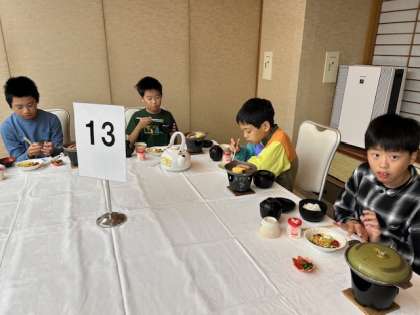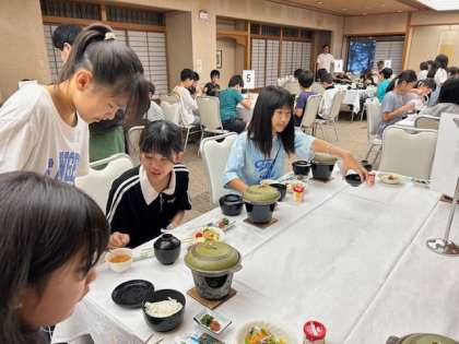 2日目の朝食をいただいています。しっかり食べて元気に出発しましょう。この後、持ち物を整理して、世界遺産厳島神社へ向かいます。