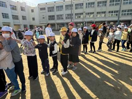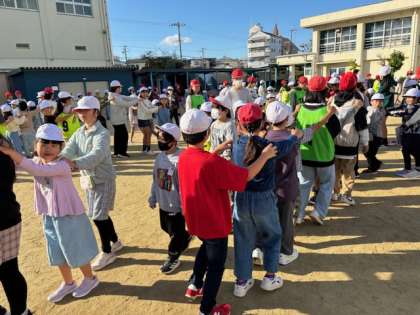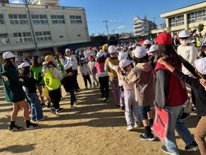 今日はみんなでじゃんけん列車をしました。一年生から六年生までが長い列になりました。みんなとても楽しそうにしています。