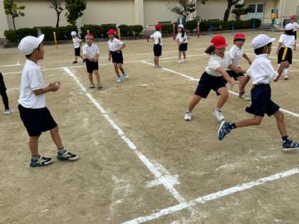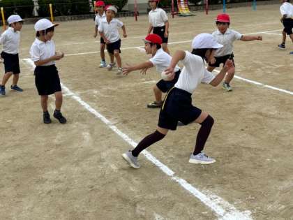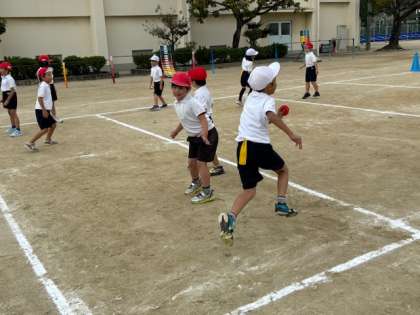今日はボール運びゲームをしています。守っている友だちにタグを取られてしまうとスタートからやり直しです。タグを取られないようにくぐりぬけてゴールをめざします。攻める方も守る方もとても運動量が多いゲームです。