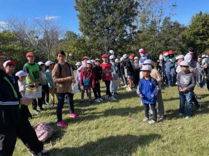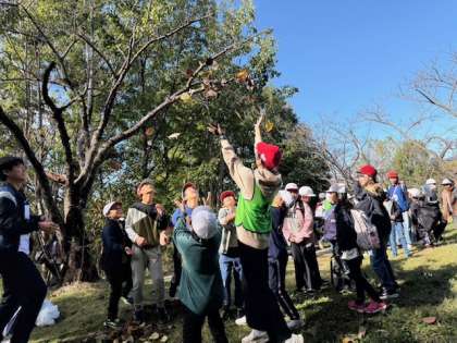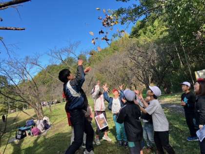こちらのポイントでは、落ちてくる落ち葉をキャッチしたり、ペットボトルキャップをキャッチしたりしています。自然の中で、子どもたちも伸び伸びと活動しているようです。