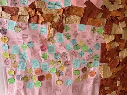 小学校の1階にありがとうの木が貼られています。先日までは幹だけだった木に、たくさんのありがとうが集まっています。たてわり遠足で一緒に活動した低学年から6年生へのありがとう。6年生からは班のメンバーへのありがとうがたくさん貼られています。とても心温まるメッセージばかりです。