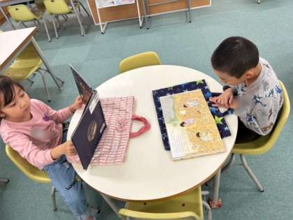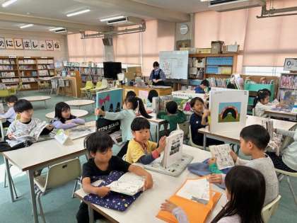 図書室をのぞくと1年生が静かに読書をしていました。図鑑や絵本、ここぞとばかり紙芝居用の大きな本を広げて読んでいる子もいました。西淡路小学校では貸出の際、パズルや漫画などのお楽しみのための本を「おやつの本」、読む力や想像する力につながる読み物を「ごはんの本」と題して読む力をつけています。