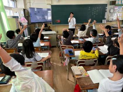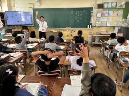 2年生は時を表す言葉、教科を表す言葉などを勉強しています。朝、昼、夜だけではなく早朝や正午、夕方など、どのくらいの時間を表しているのか考えながら覚えていきます。教科はいつも勉強しているのでたくさん手があがりました。