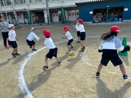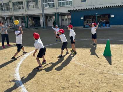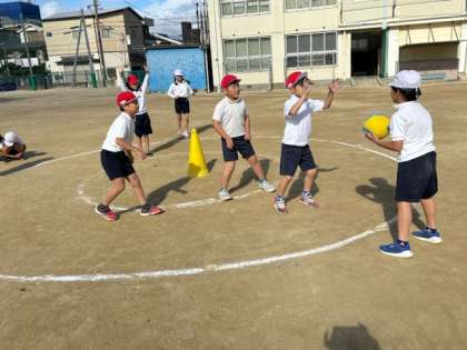 2年生は運動場でボールあてゲームをしています。真ん中に置いたコーンをめがけてボールを投げ、当たれば得点できます。守る子どももサークルの中でボールを止めようとしています。パスをしながら上手くコーンに当てることができています。