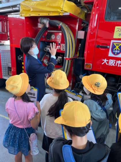 3年生は東淀川消防署へ社会見学に行きました。消防署では消防車を見せていただいたり、消火訓練の様子を見せていただいたりしました。間近で見る消防車に子どもたちも興味津々だったようです。まちの安全を守ってくださる消防士さんはかっこよかったです。