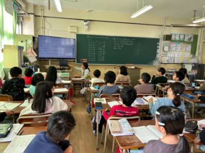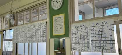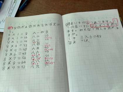 2年生はかけ算の九九を学習しています。今日で8のだんまで学びました。九九を覚えることも大切ですが、文章問題の中にある「〜ずつ」「みんなで」などの言葉について考えたり、絵に表したりしながら式を立てることができました。