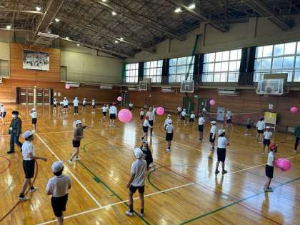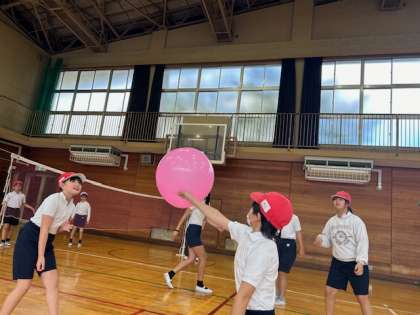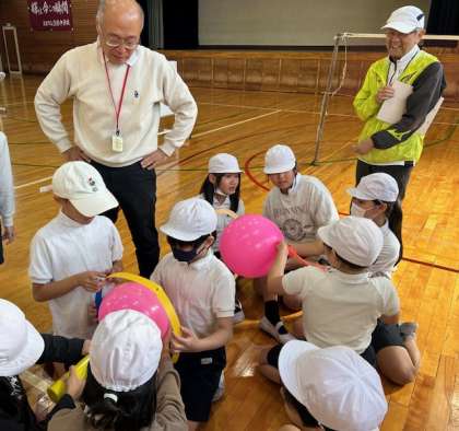 5年生、まずは風船の大きさに驚きです。公式のバレー用の風船を触らせてもらいました。膨らませる大きさが決まっていたり目の不自由な方でも風船の位置を感じ取れるように中に鈴が入っていたりと風船にも決まりがあります。ルールも通常とは違いチームのみんなが触れることができたら相手チームに返します。みんなが楽しくできることを心がけながら学ぶことが出来ました。12月には西淡路希望の家の方に来て頂き、ふうせんバレーの交流をする予定です。