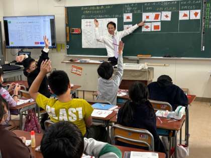 1組は算数の図形の学習です。平行な直線に注目して四角形を分類し、台形や平行四辺形の特徴を考えました。