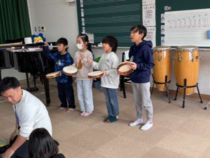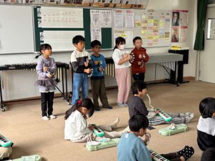 2年生は鍵盤ハーモニカが上手く弾けるようになってきました。かっこうの曲を弾いています。すずやタンブリンの音も入って演奏しています。