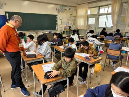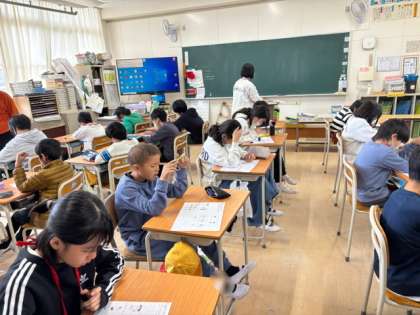 今日はリスニングの練習をしています。英語で流れてくる音声を聞いて、どの絵を説明しているか答えています。キーワードとなる単語をしっかり聞き取り答えを選択しています。