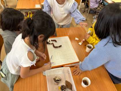 1年生は秋の木の実を使っておもちゃ作りをしています。どんぐりや松ぼっくりを使って、マラカスやけん玉、迷路などを作っています。できあがったら、みんなで遊ぶのでしょうか。班で協力して楽しそうに作業しています。