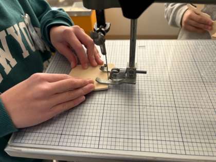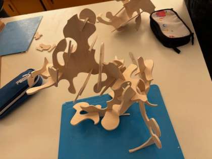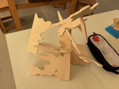 5年生は電動のこぎりを使って工作をしています。デザインした通りに木の板を切るのはとても難しいですが安全に気をつけながら、慎重に切っています。カットした板を組み合わせてイメージした形につなぎ合わせています。