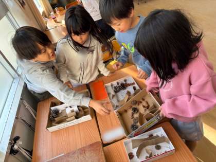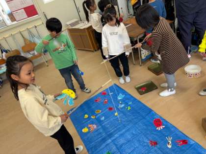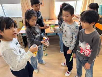 今日は自分たちで作ったおもちゃを並べてお店屋さんをしています。工夫して作ったおもちゃなので、遊びに来た子どもたちもとても楽しそうです。使い方やルールも自分たちで説明しています。とても立派です。