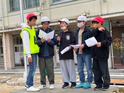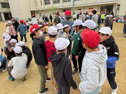 今日は集会委員会の児童が行うゲーム集会です。「学校へ行こうよ」というゲームをしました。集会委員会のかけ声に応えて「学校へ行こうよ!」と言います。その後に発表されるキーワードの文字数と同じ人数でグループになります。みんなで仲間を探しています。