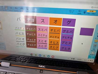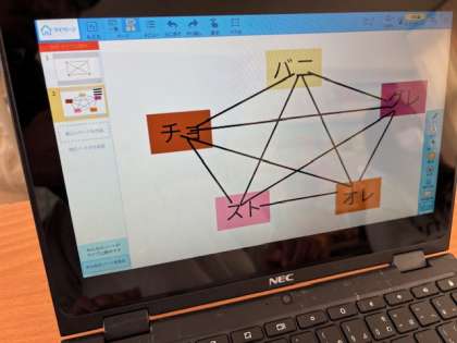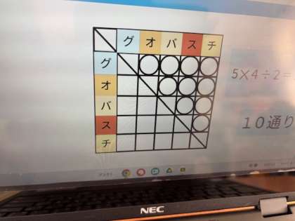6年生は組み合わせの学習をしています。5種類のアイスクリームの中から2種類を選ぶ組み合わせは何通りあるかを考えています。子どもたちは図を描いて、もれがないかを確認しながら学習しています。タブレットで図を描いている子どももいます。
