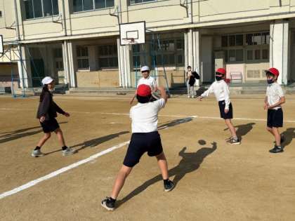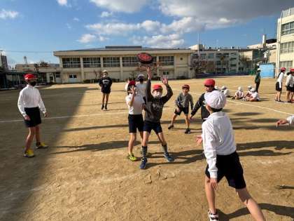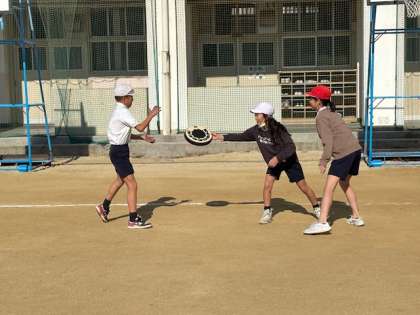 5年生は体育でアルティメットをしています。チームに分かれて試合をして盛り上がっています。空いているスペースに走りこみパスが繋がるように動くのが上手になってきました。止まると寒いので、「動け〜」と応援されています。