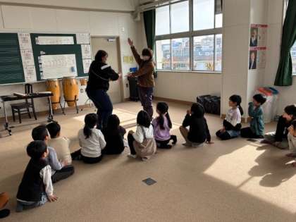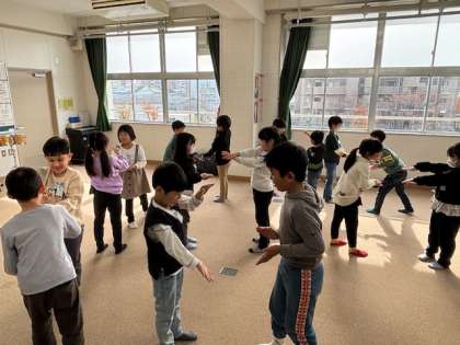 今日は手遊び歌をしています。お餅つきの手遊び歌をみんなで楽しく歌っています。先生のやり方をよく見て、子どもたちもチャレンジしています。リズムに合わせてタイミングよく手を打ちます。ペアで協力して上手くできたかな??