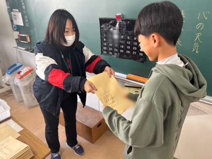 今日は2学期最終日です。教室では通知表を渡してもらって、頑張ったことを褒めてもらっています。ご家庭でも2学期の子どもたちの頑張りを褒めていただき、冬休みも規則正しい生活をさせてあげてください。
